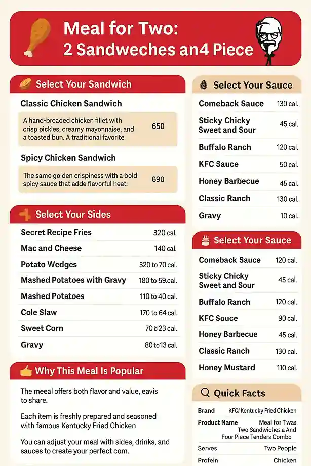 The KFC Meal for Two is more than a meal. It is a shared experience that blends comfort, taste, and variety in a single order. It gives you control over every choice, from the sandwich to the sauce, and it always delivers that familiar KFC flavor you love.